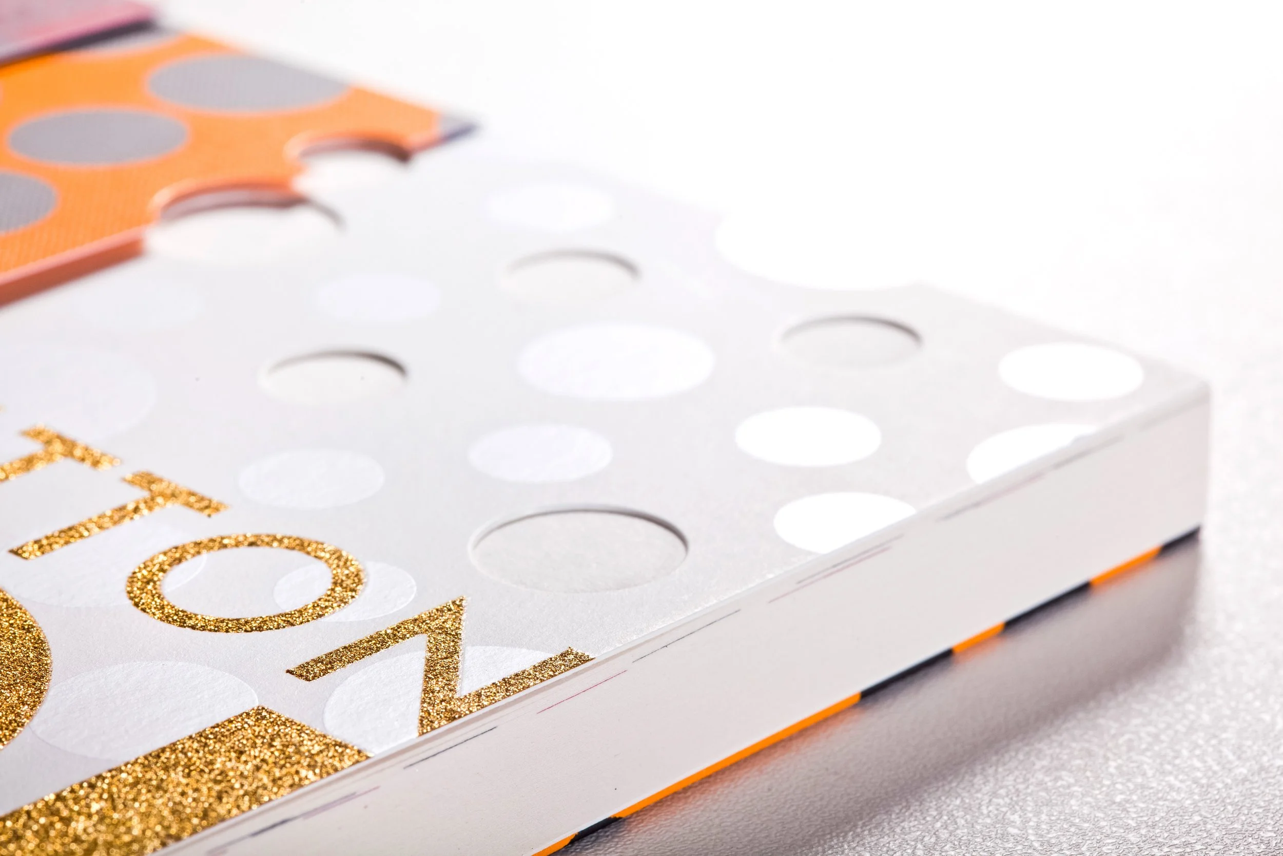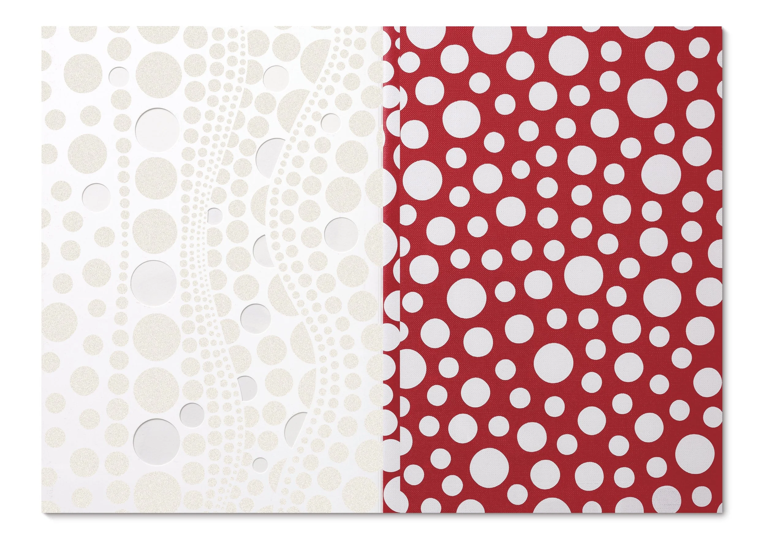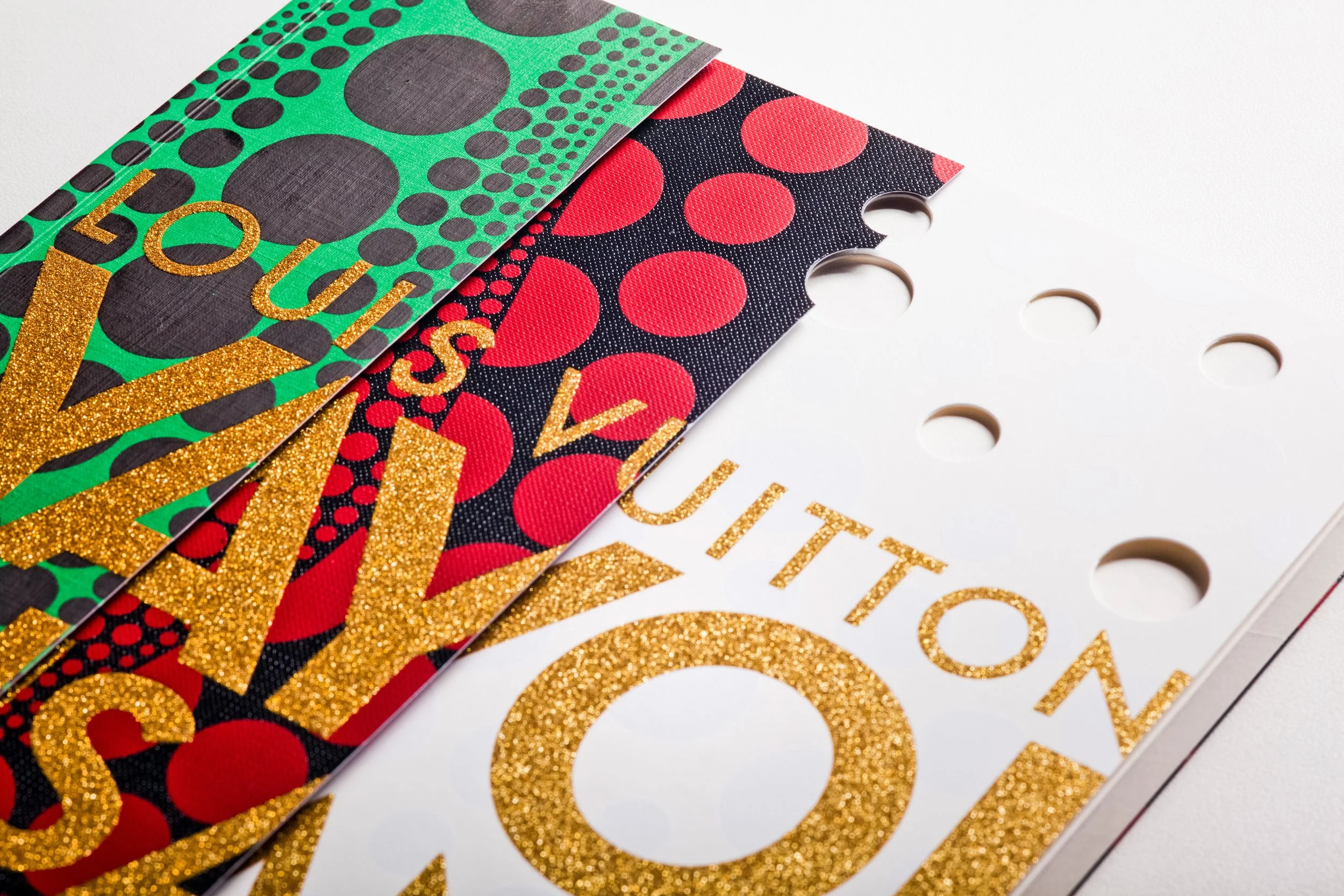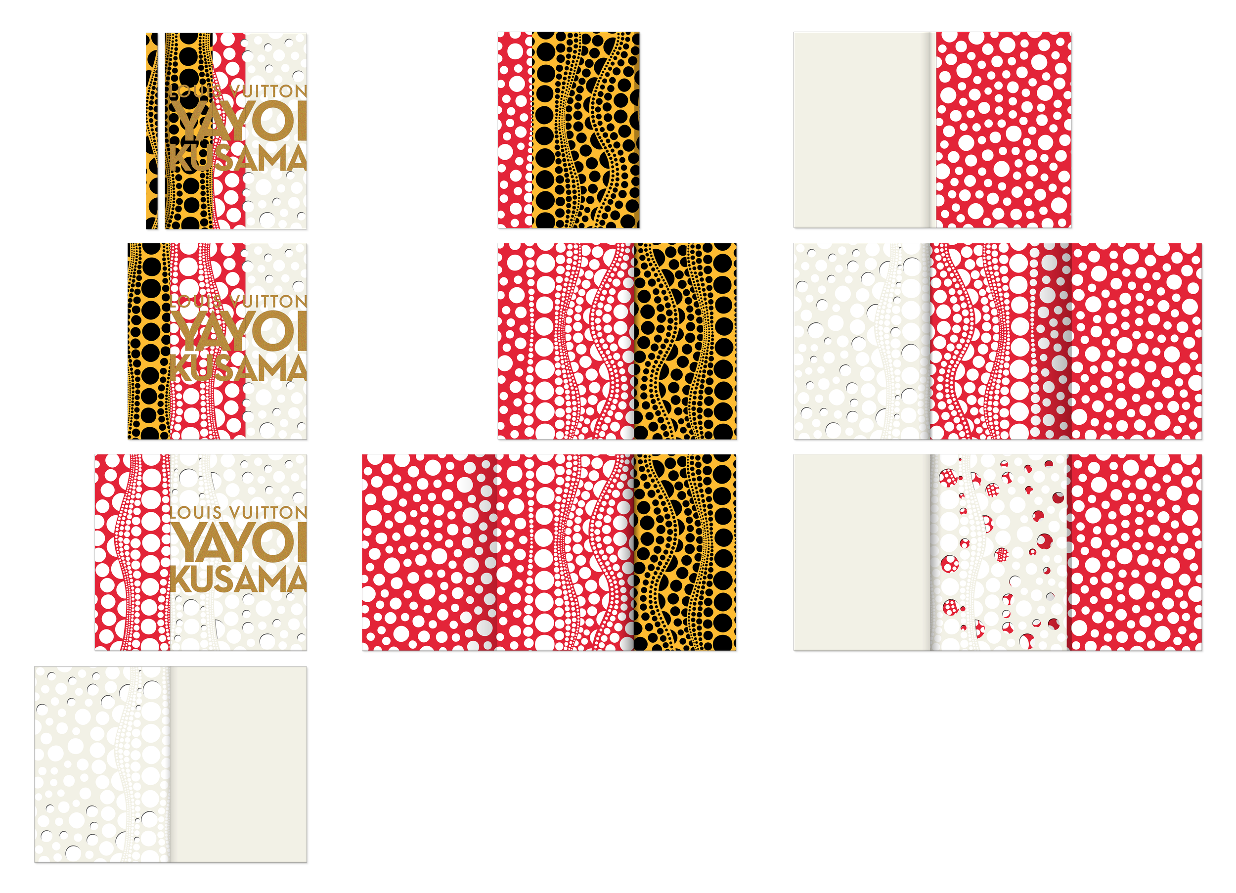 Aside from silkscreen and die-cut production methods, the three-fold cover uses three different materials, including a paper that resembles the Louis Vuitton paper bag, and also a canvas material. The latter depicts the art canvas that Kusama uses for her drawings.