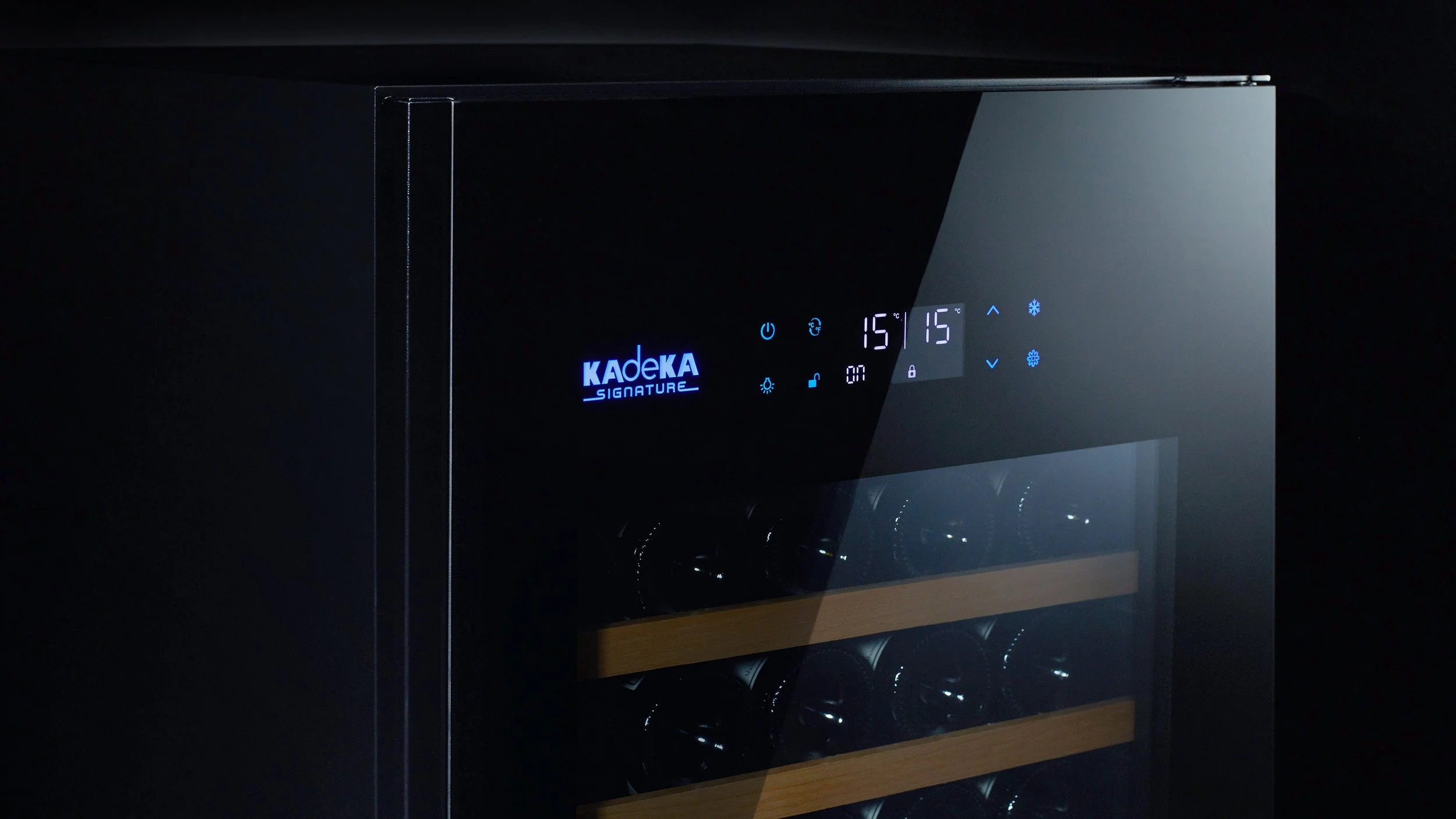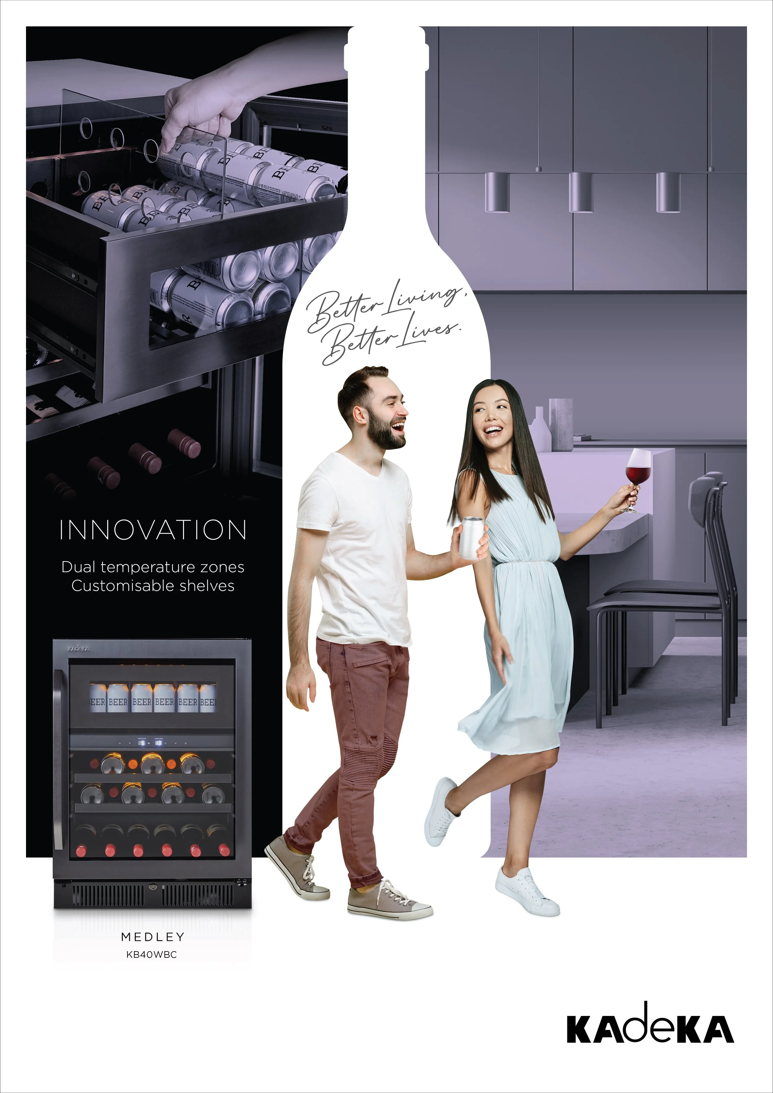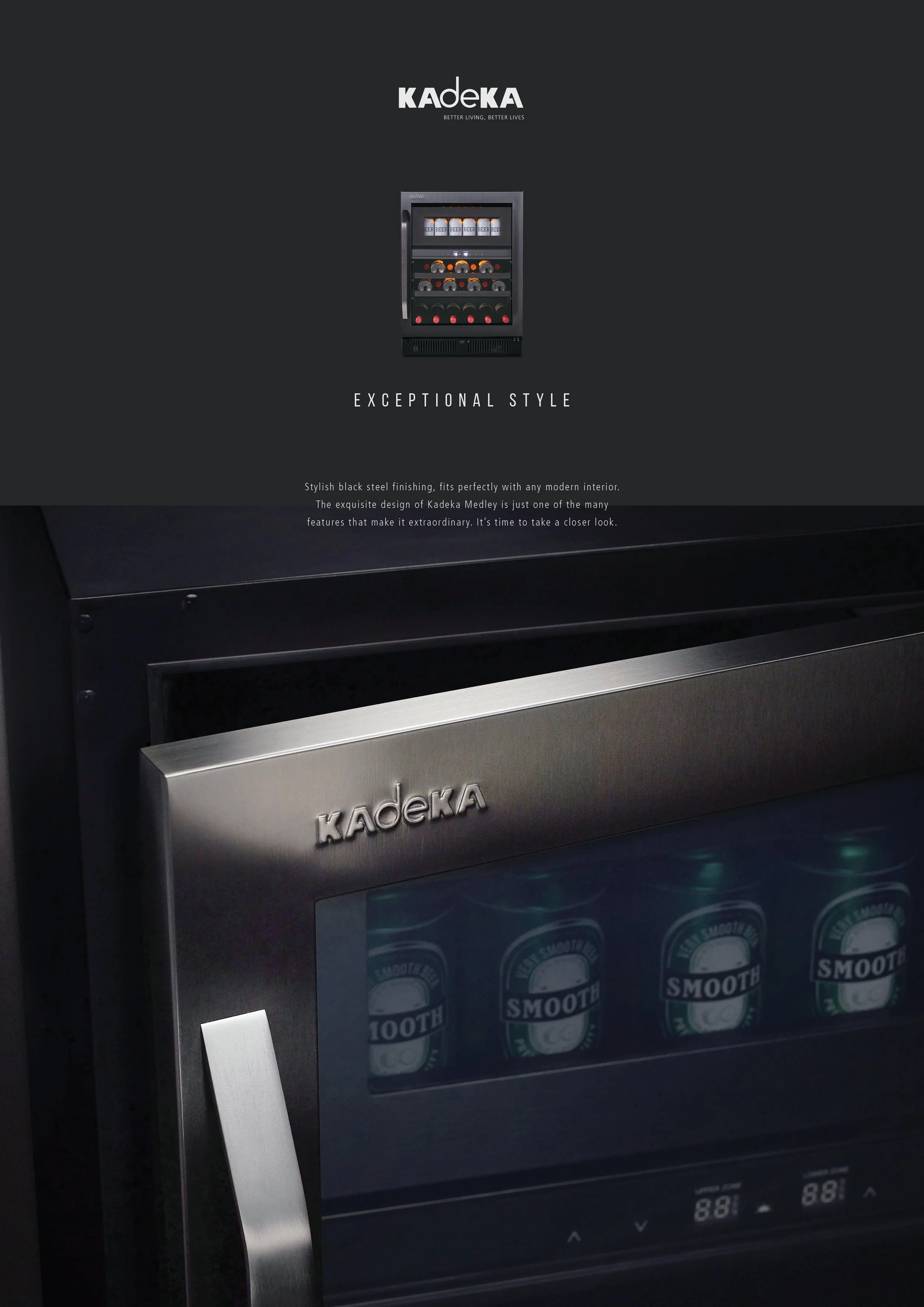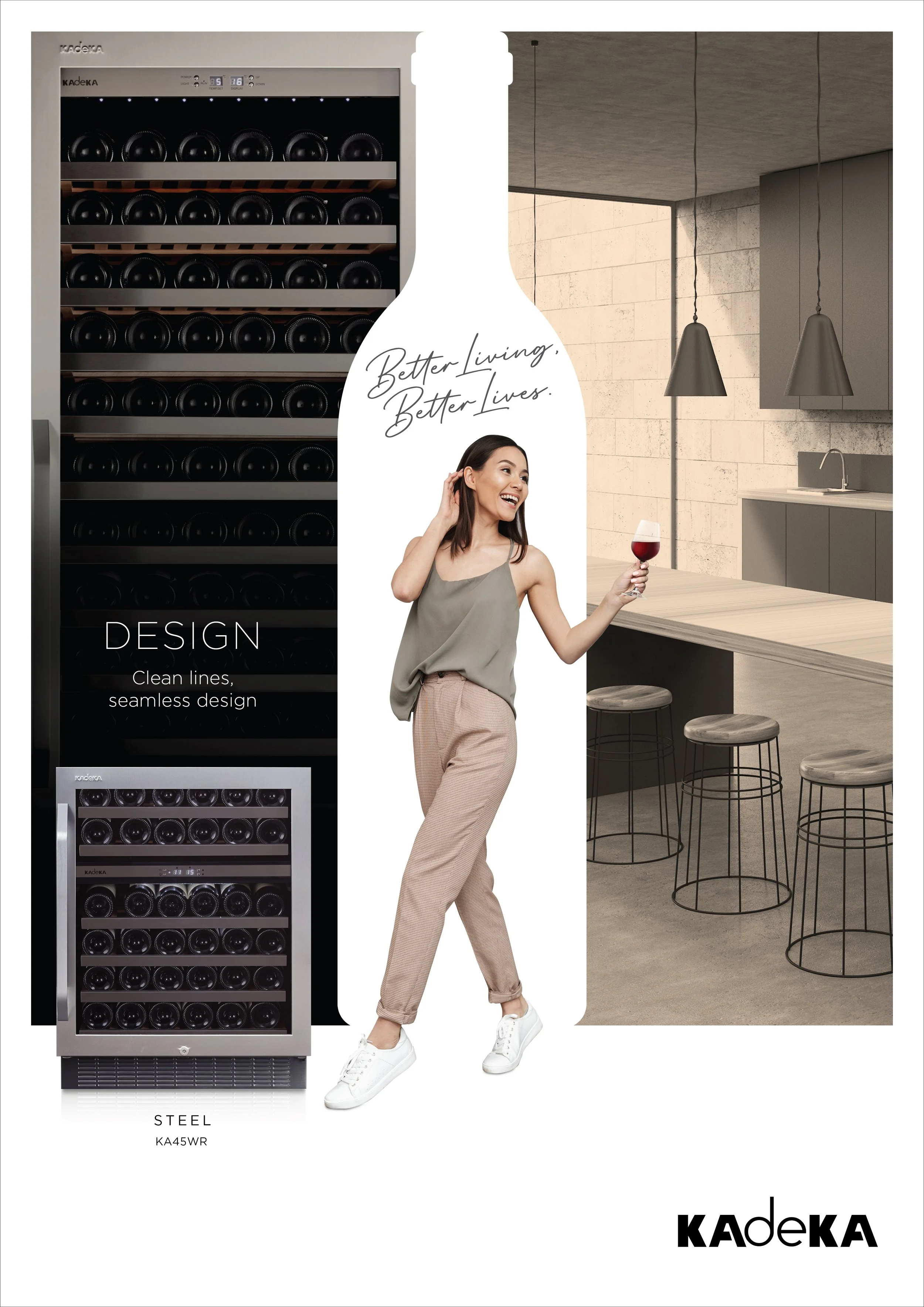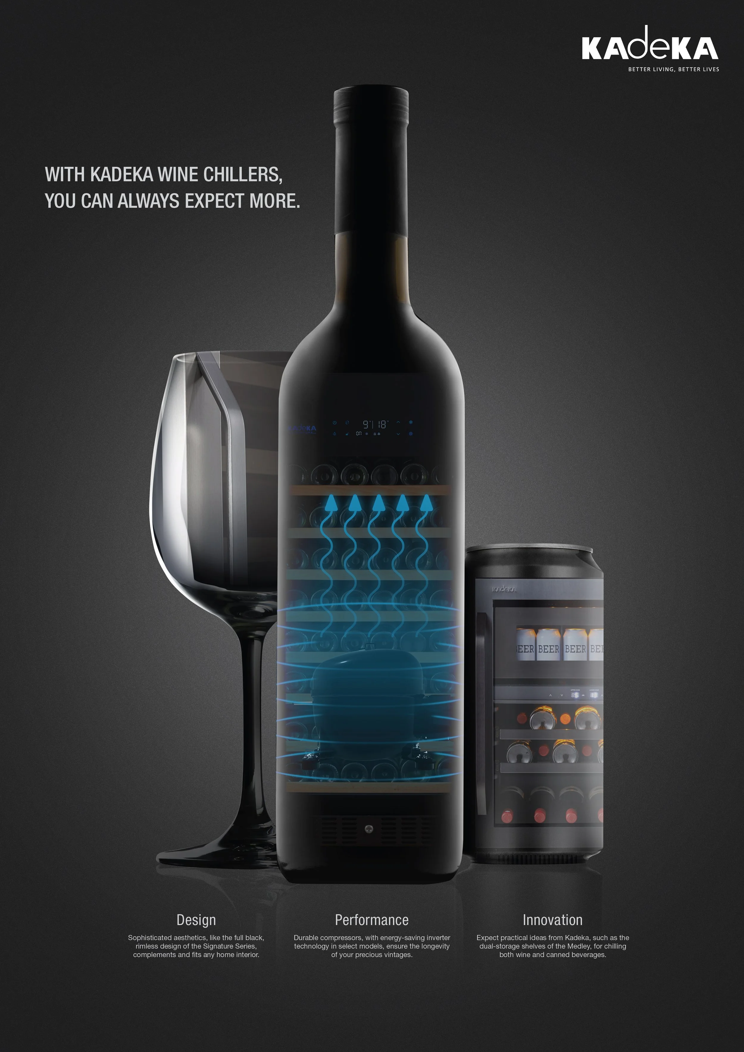 Set against a refined display of a wine glass, wine bottle, and beer can, this concept integrates the key features within these familiar objects, each symbolizing a core benefit: the glass embodies Design, the bottle represents Performance, and the can signifies Innovation. The headline encapsulates this visual concept with an aspirational message about the exceptional experience customers can expect from Kadeka Wine Chillers.