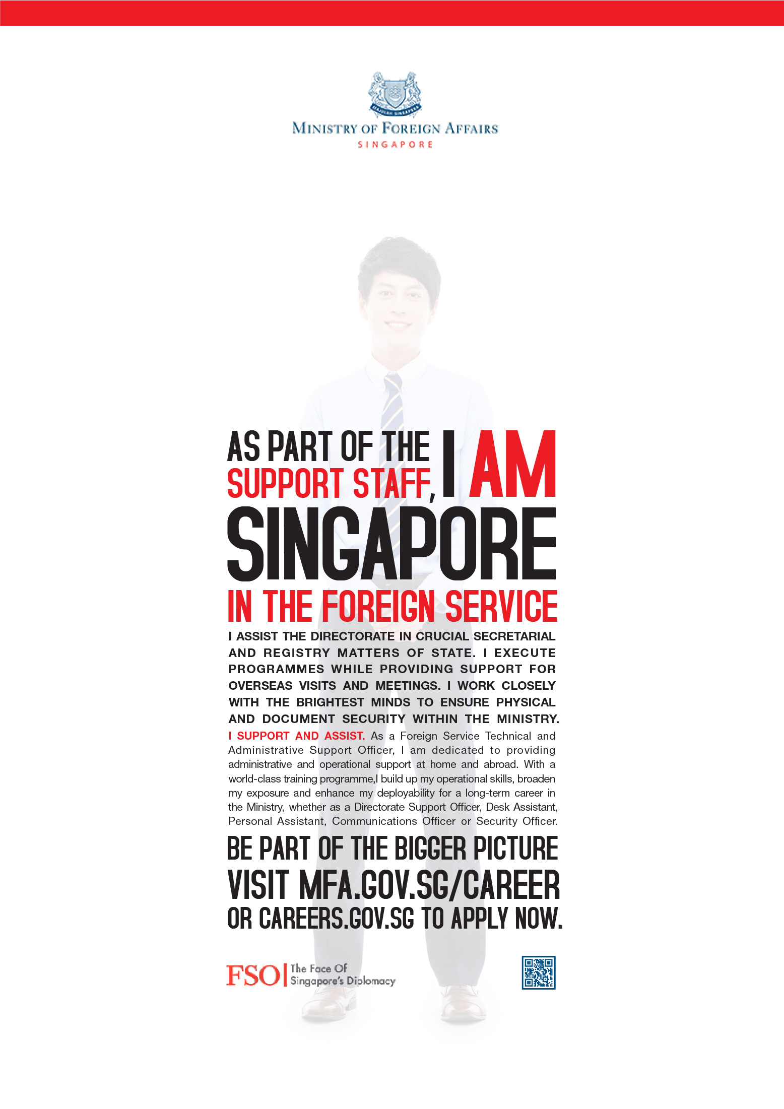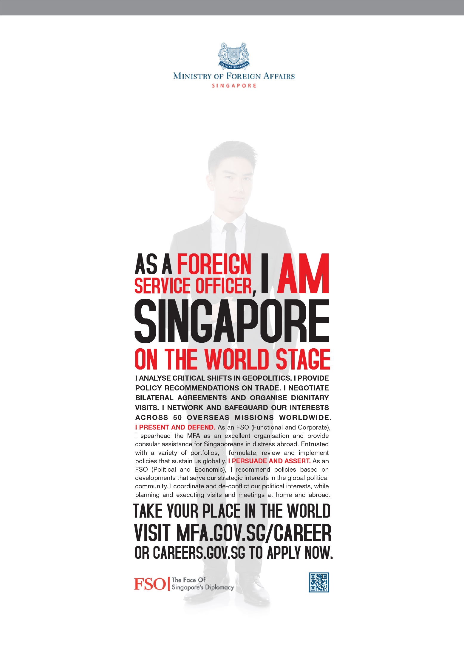 A recruitment campaign for the Ministry of Foreign Affairs, titled “I Am Singapore,” positions candidates as the ultimate representatives of the nation.