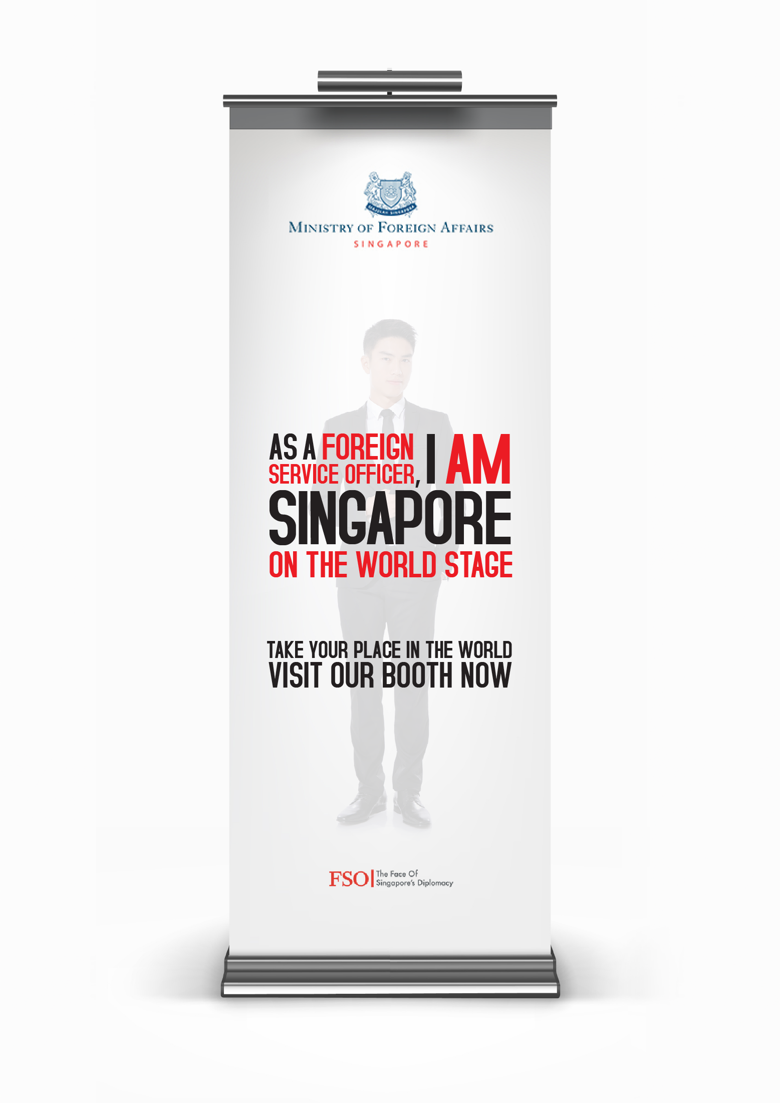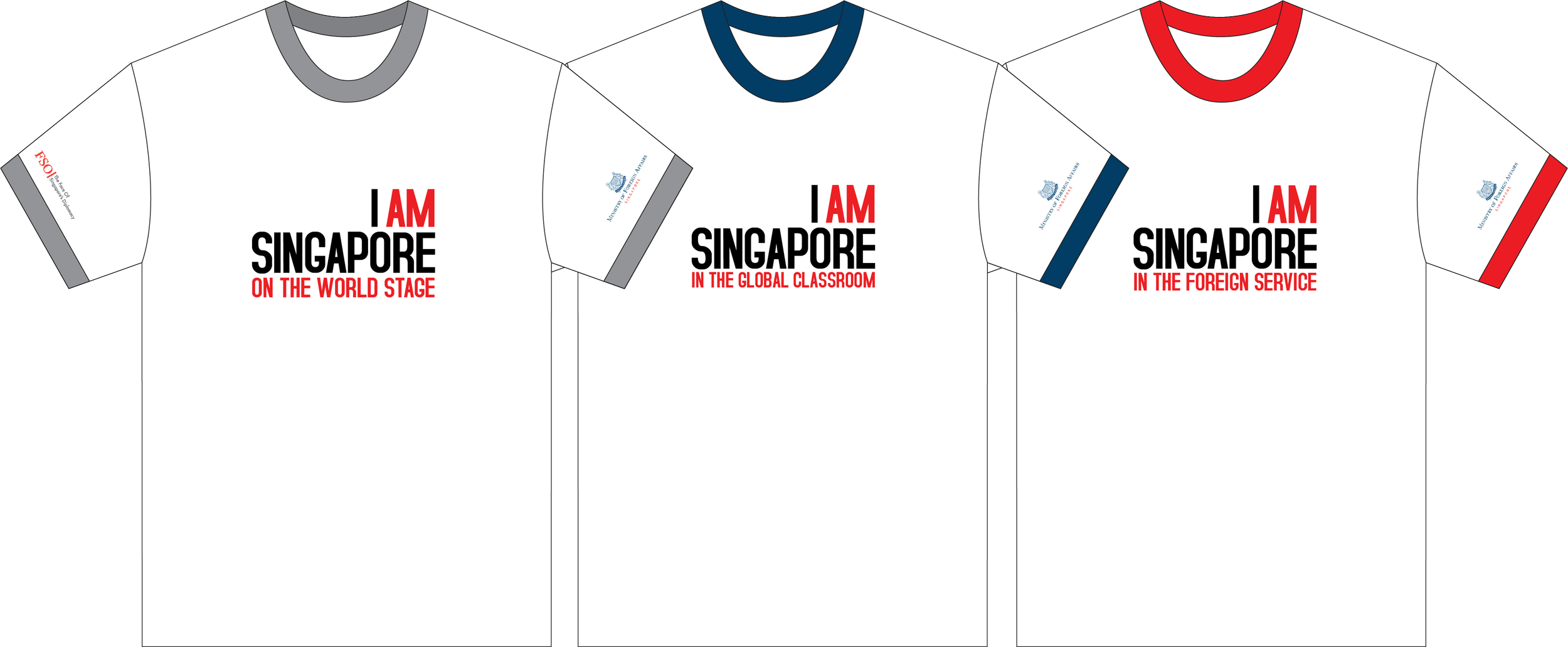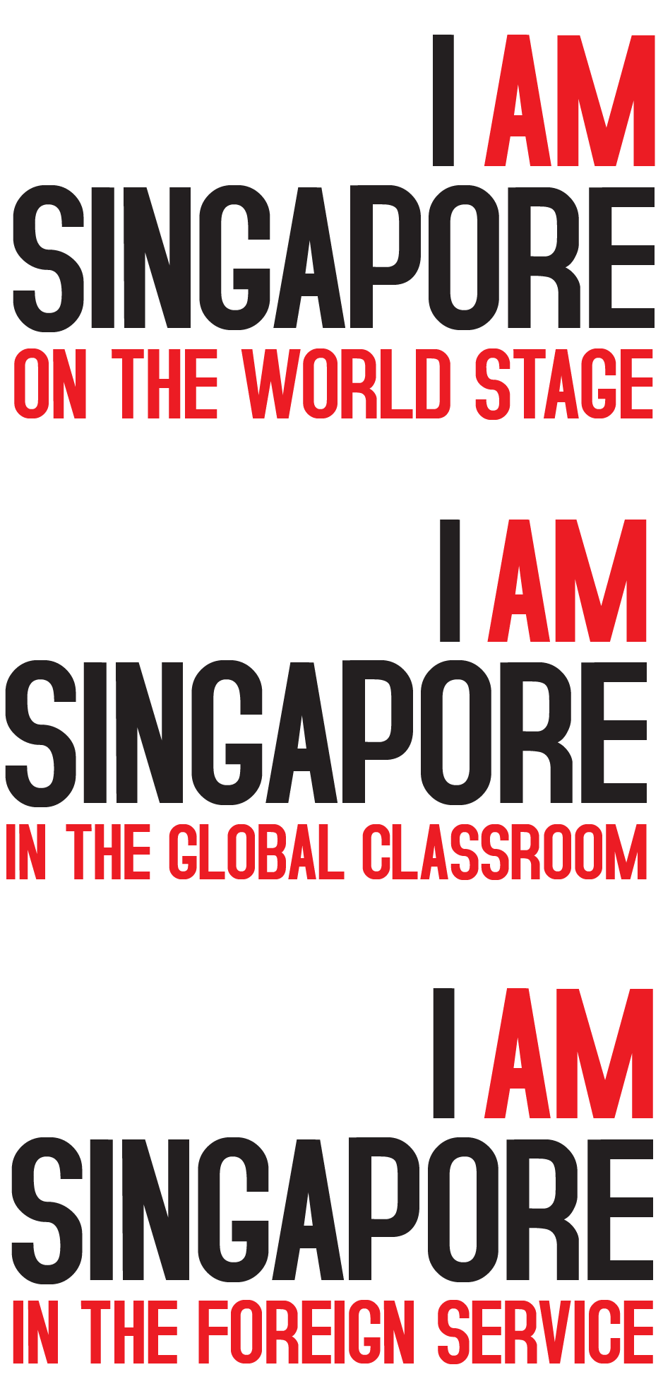 Tailored wordplay highlights the distinct contexts—on the world stage, in global education, and within the foreign service—reinforcing the unified message of “I Am Singapore” while inspiring pride and purpose in candidates.