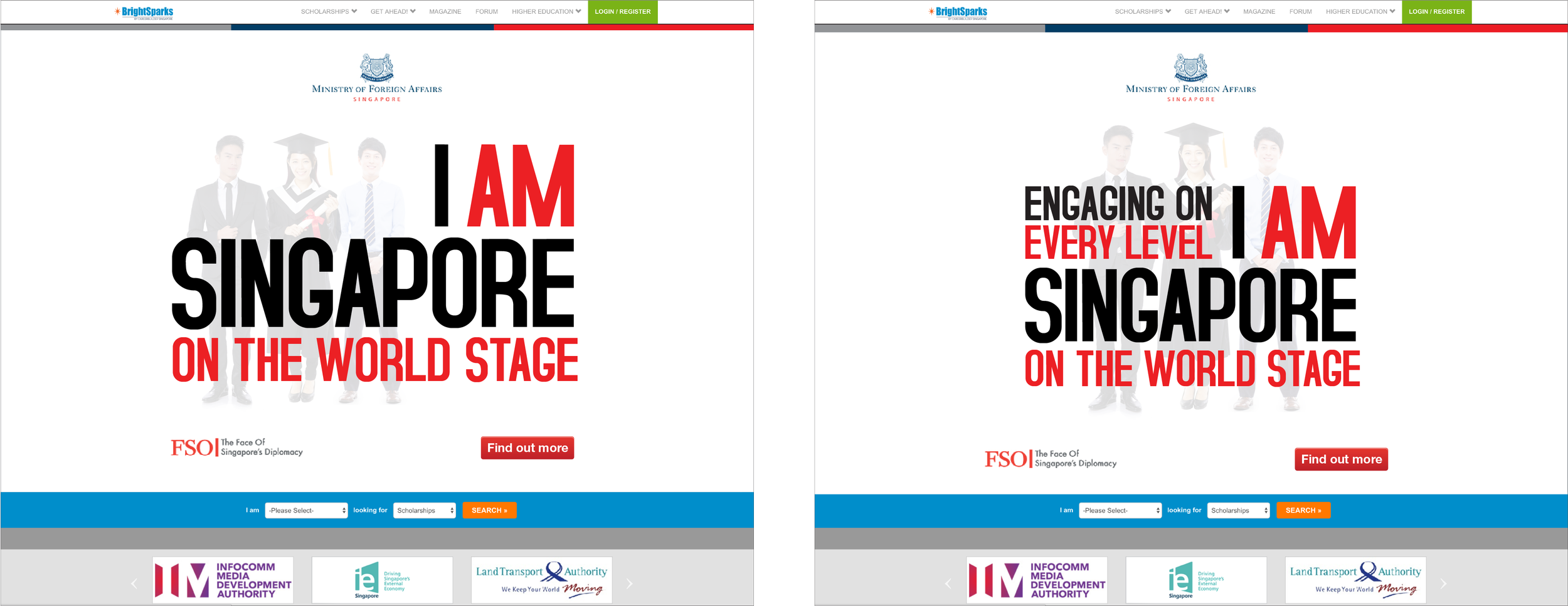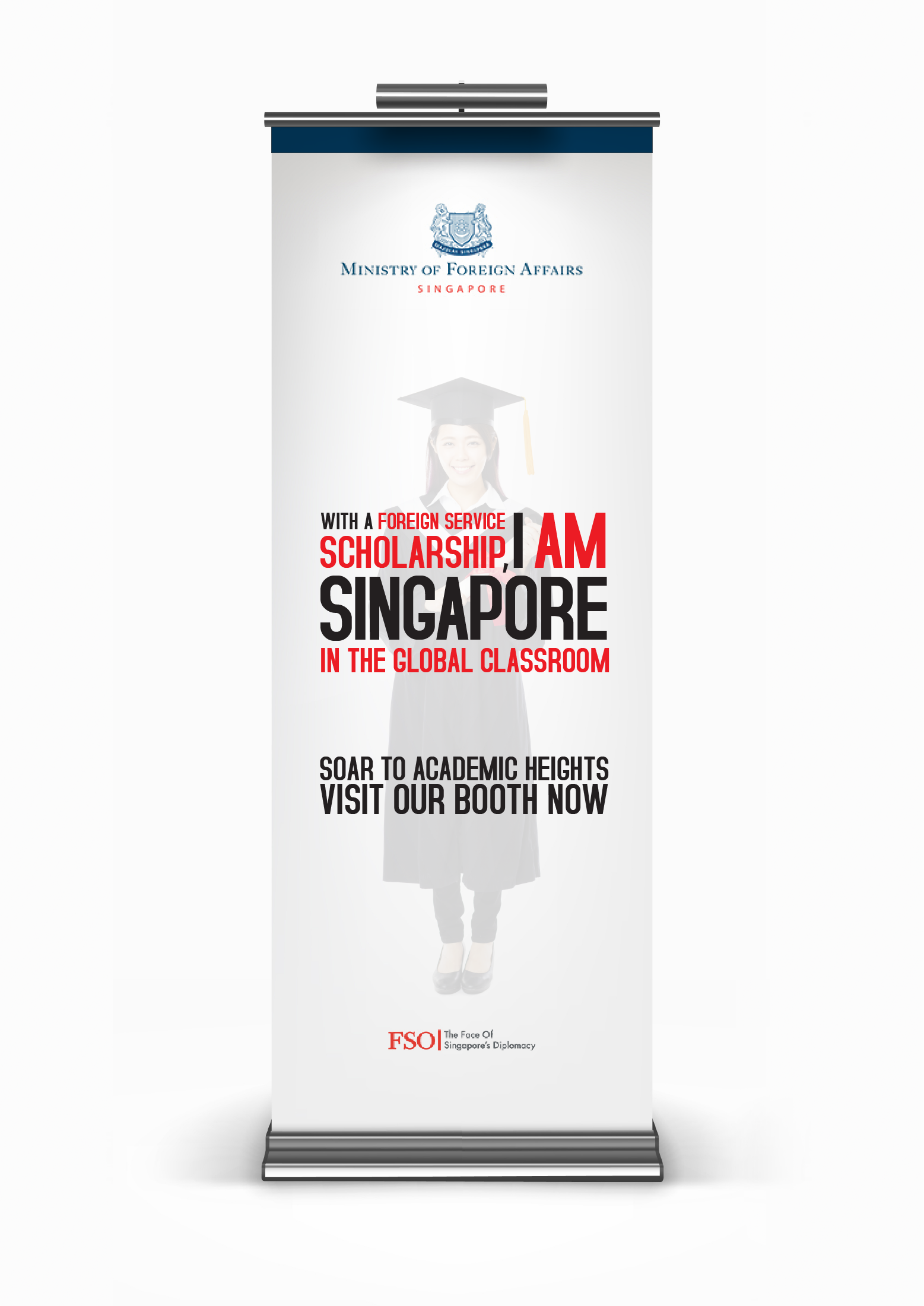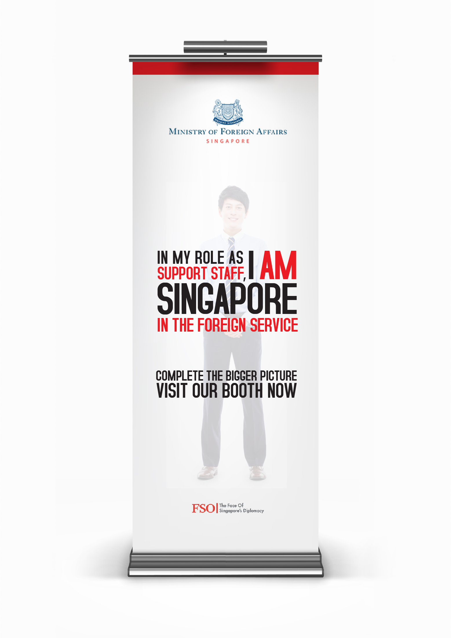 Tailored wordplay highlights the distinct contexts—on the world stage, in global education, and within the foreign service—reinforcing the unified message of “I Am Singapore” while inspiring pride and purpose in candidates.