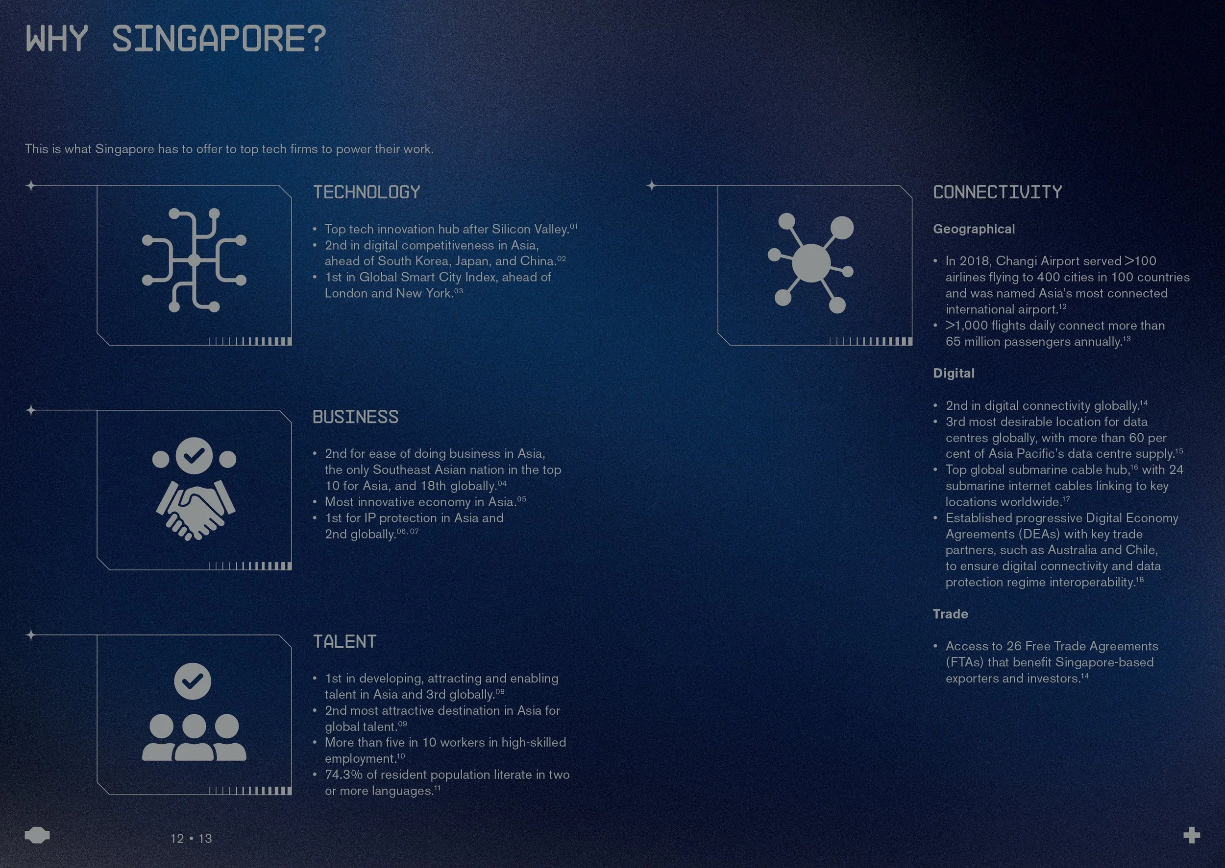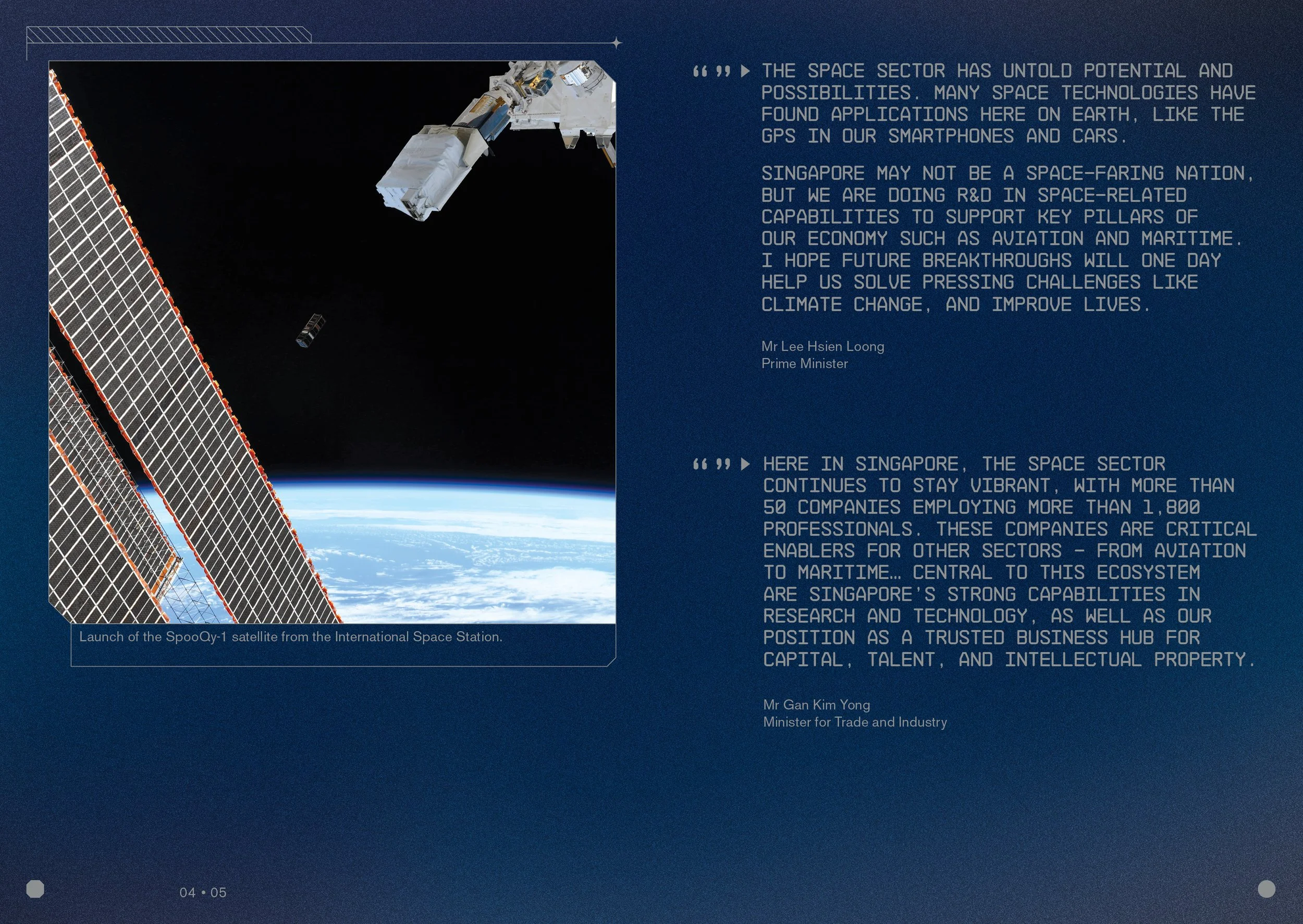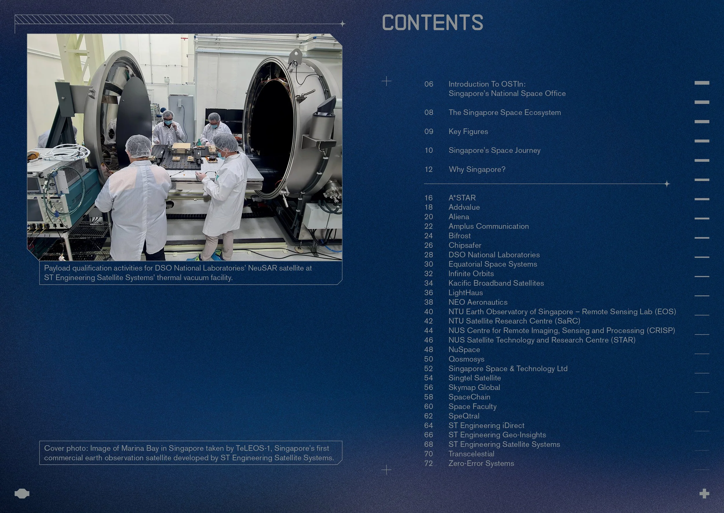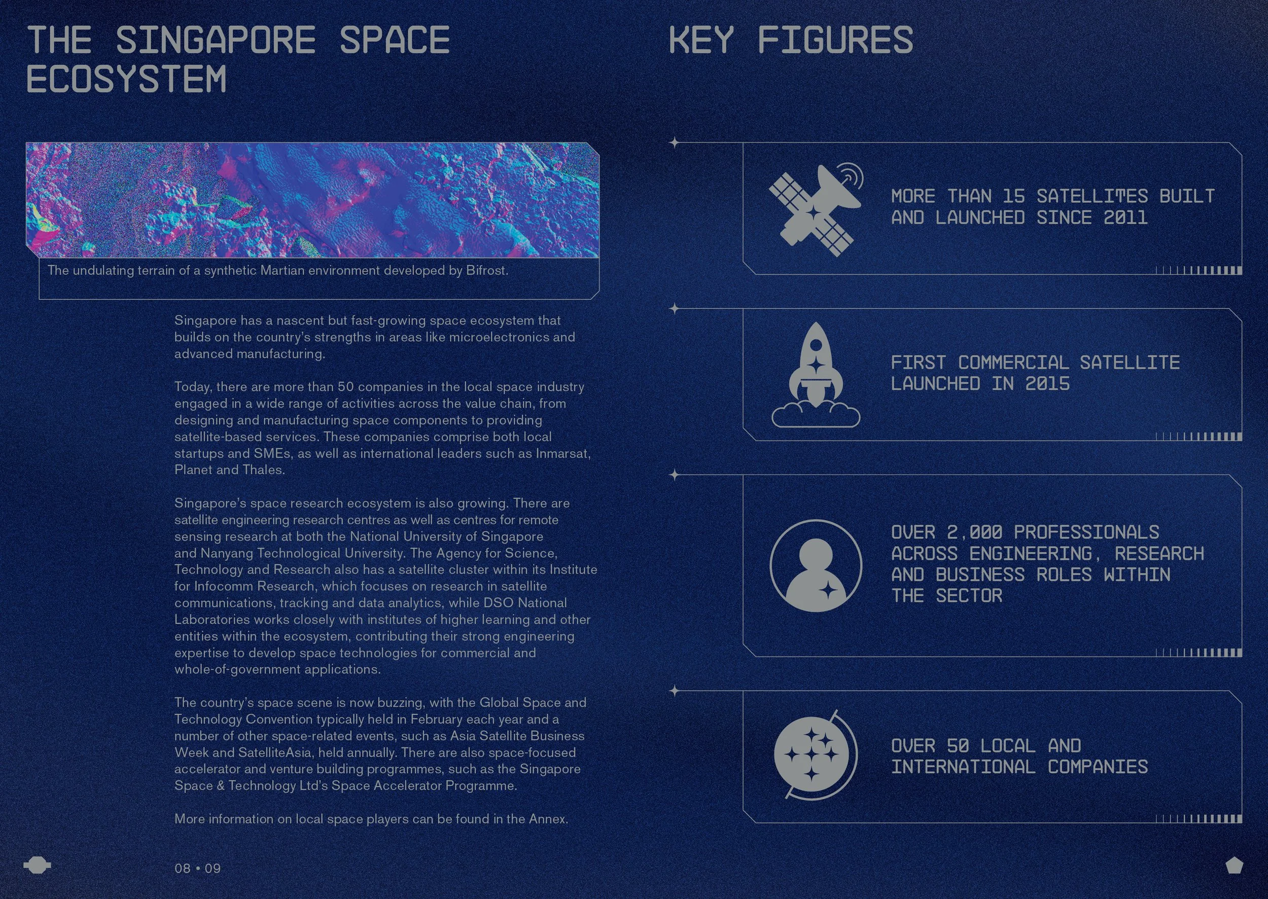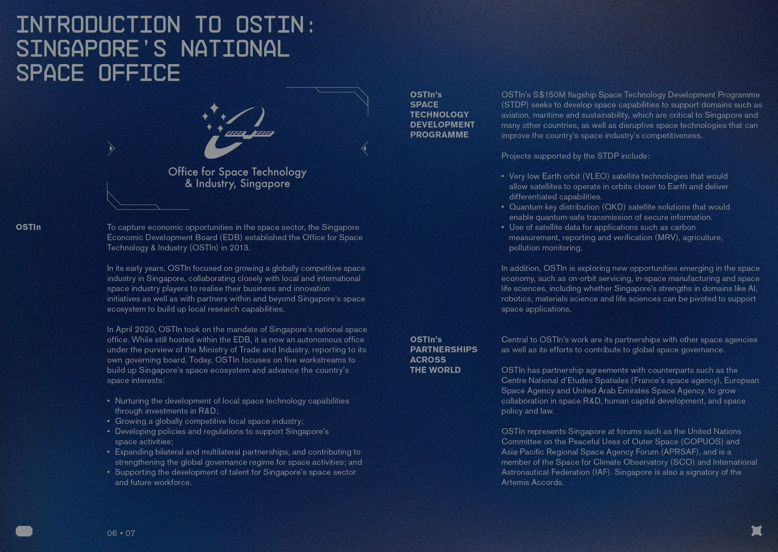This brochure for the Office for Space Technology & Industry (OSTIn) highlights Singapore's competitive space ecosystem, blending innovation with practical impact. Designed with a modern, yet grounded aesthetic, it aims to attract global partnerships, talent, and space companies to grow in Singapore. The space-themed design reflects a forward-thinking vision while remaining approachable and engaging.
