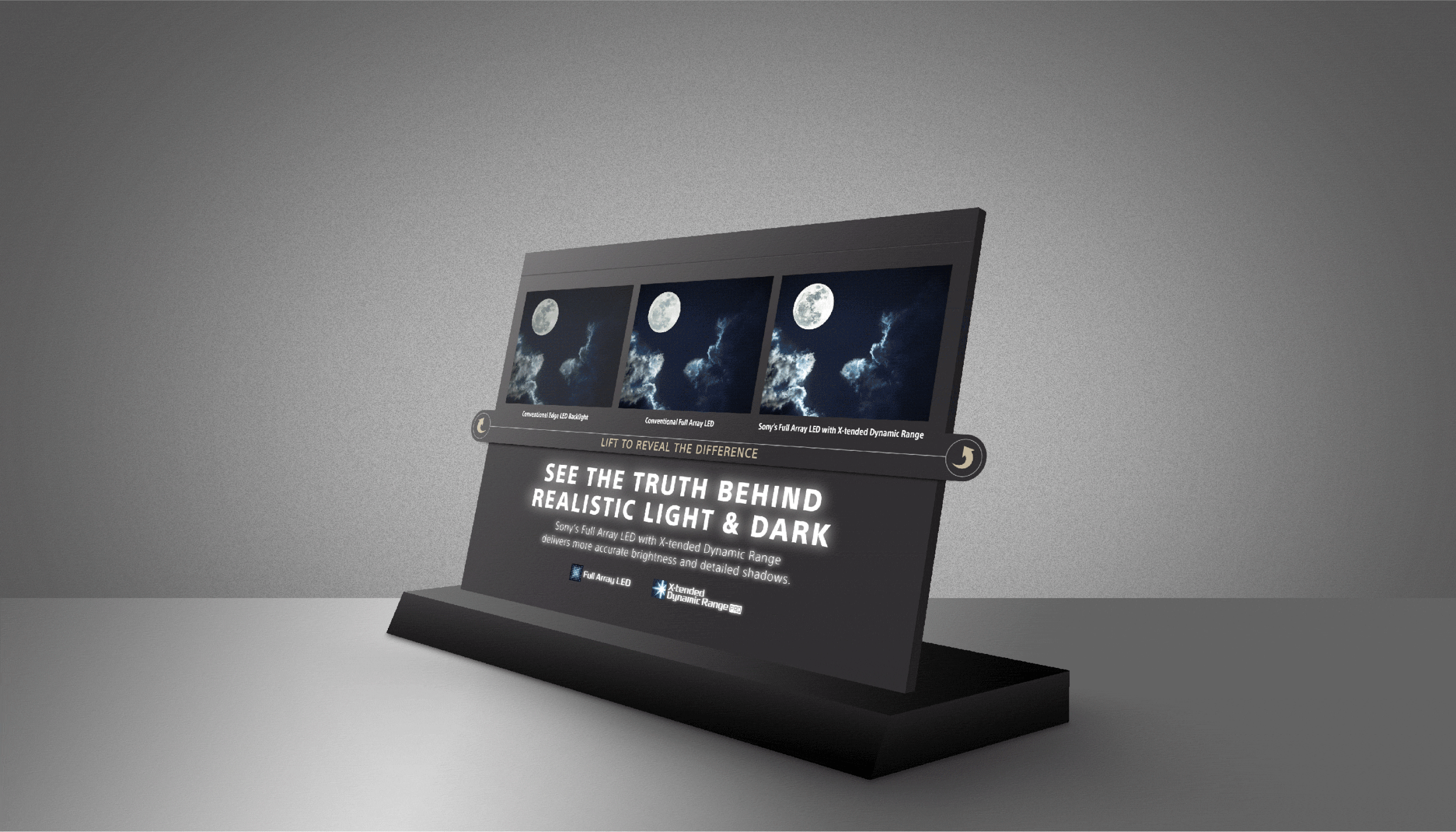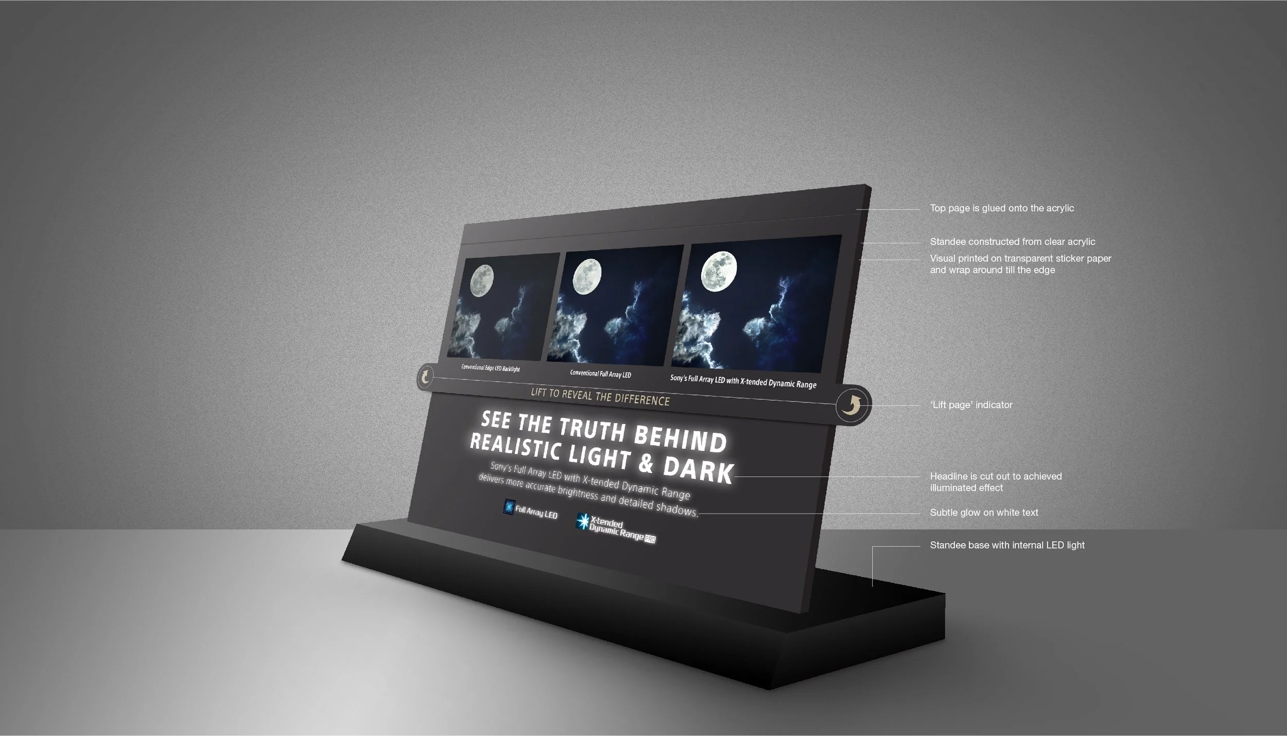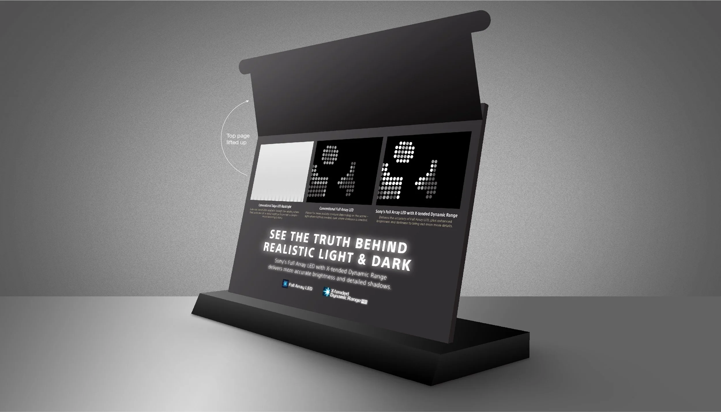 Designed as an in-store table standee, this display invites customers to explore the cutting-edge LED technology of Sony Bravia TVs.
